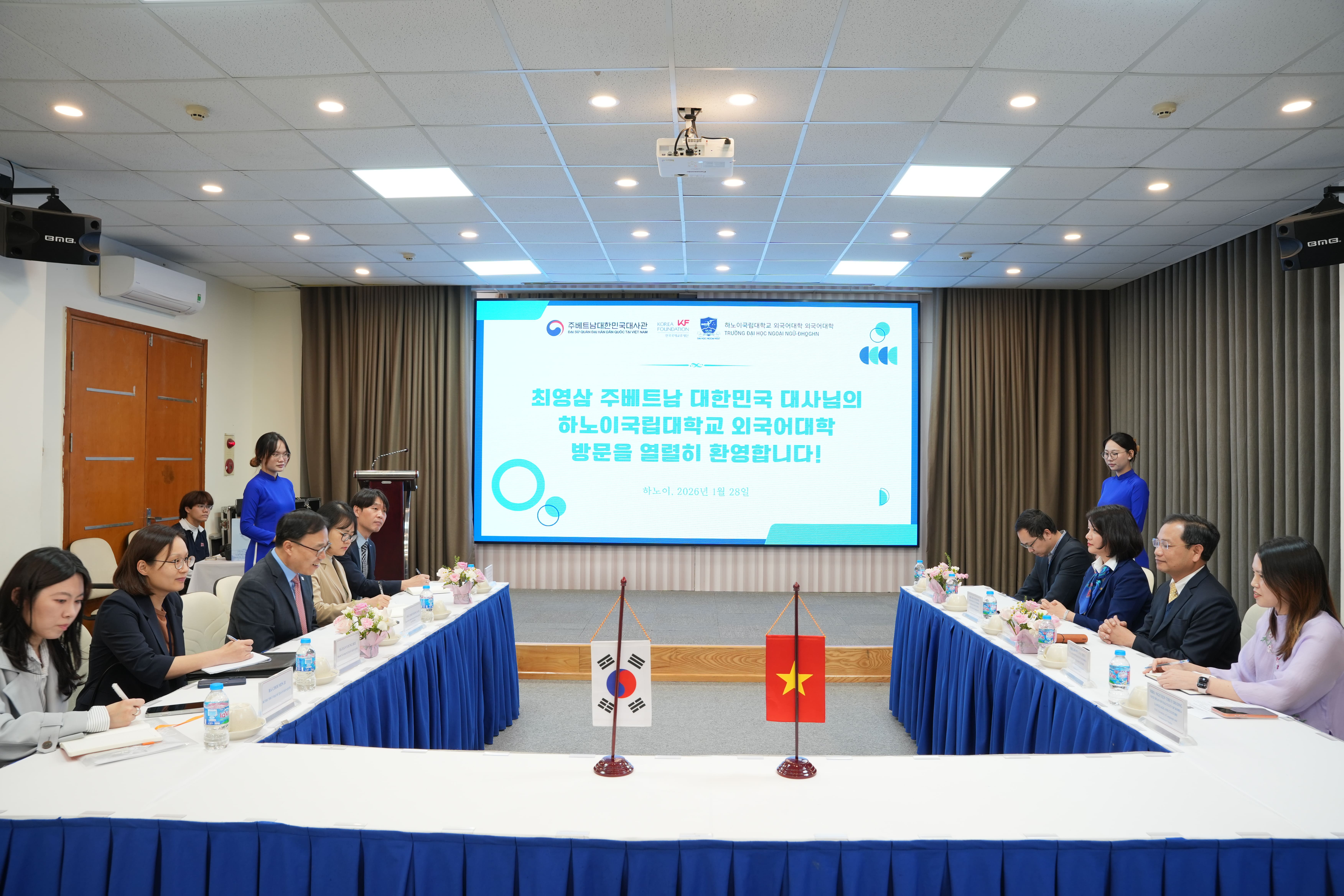 한편, 최 대사는 강연에 앞서 화 응옥 선(Hoa Ngoc Son) 부총장과 면담을 갖고, 하노이국립외대가 베트남 내 한국어 교육 확산에 있어 선도적인 역할을 수행하고 있음을 높이 평가했습니다. 또한, 한국국제교류재단(KF), 한국 교육부 등 한국 각계와 학교가 추진 중인 교류협력이 더욱 내실있게 발전할 수 있도록 대사관 차원에서도 적극적인 지원과 협력을 이어가기로 했습니다.